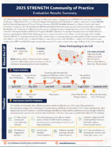 The 2025 Supporting Tobacco-Free Recovery for Next Generation Thriving Heroes (STRENGTH) Community of Practice (CoP) was a collaborative effort co-led by the National Behavioral Health Network for Tobacco and Cancer Control (NBHN) and the National Association of Chronic Disease Directors (NACDD) Disability Network for Tobacco Control and Cancer Prevention. Faculty for the CoP included the NBHN and Disability Network teams; partners from the University of Alabama at Birmingham; the University of California San Francisco’s Smoking Cessation Leadership Center (SCLC); the University of Colorado’s Behavioral Health and Wellness Program (BHWP); Lakeshore Foundation; National Center on Health, Physical Activity, and Disabilities (NCHPAD); Washington State Department of Veterans Affairs; and the Michigan Public Health Institute (MPHI). To best demonstrate the CoP’s overall impact in assisting states to initiate and/or enhance practice changes that address commercial tobacco-related imbalances impacting veterans with disabilities, a mixed methods evaluation was conducted by MPHI and NACDD using multiple data sources. This report presents the major findings of the CoP evaluation.