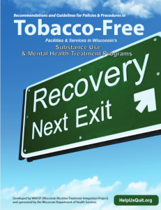 The Wisconsin Nicotine Treatment Integration Project (WiNTiP) developed recommendations on how treatment facilities can become tobacco-free. This document provides mental health/substance use treatment programs and state governing bodies with a roadmap about specific elements and steps that collectively constitute a tobacco-free treatment setting. It emphasizes: 1) the importance of a tobacco-free healthy treatment setting; 2) the provision of evidence-based tobacco dependence treatment; and 3) the necessity of helping staff who have tobacco dependence to quit.